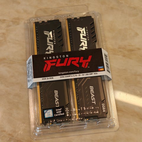Selger et sett med Kingston FURY Beast RGB DDR5-minne, totalt 64 GB (2×32 GB).
