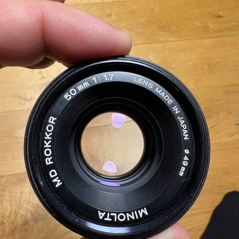 Selger et Minolta MC Rokkor-PF 55mm f/1.7, et klassisk og svært skarpt normalobjektiv fra Minolta. Kjent for god kontrast, naturlige farger og behagelig bakgrunnsuskarphet.