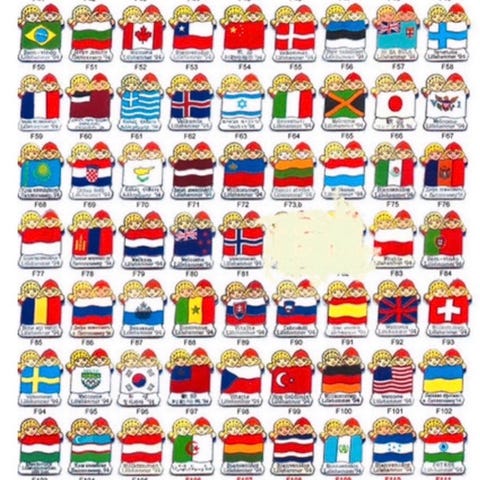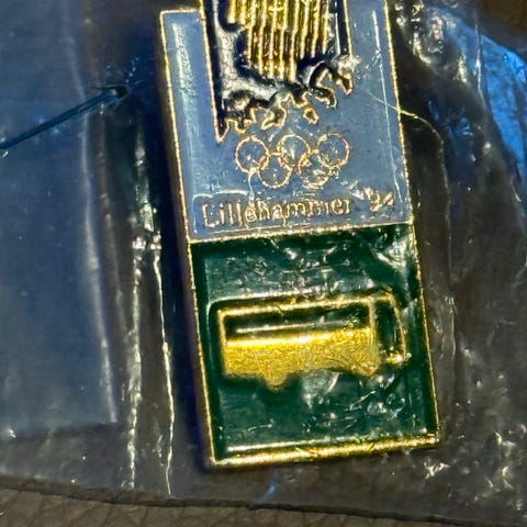 Lillehammer 94 OL-pin med olympiske ringer og teksten 'TAKK'.