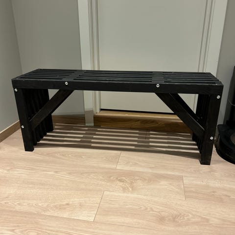 Pent brukt benken til gangen i mørkegrønn og messing farge.