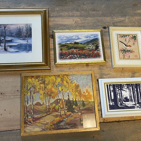 To innrammede bilder med motiv av valper (labrador) og fugl.