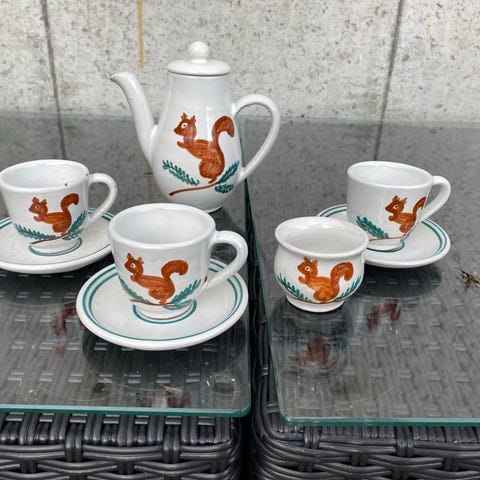 Fint gammelt barneservise i porselen. Noe bruksmerker her og der. Kanna er ca 15cm høy. Billigste porto blir 69kr med Postnord utenom fiksferdig.