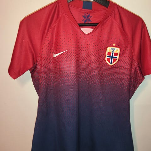 Nike Norge fotballdrakt kvinne i fargene rød og marineblå. Kortermet design med Norges fotballforbunds emblem på brystet.