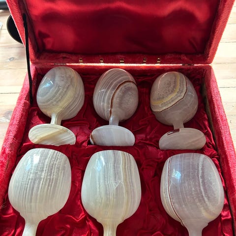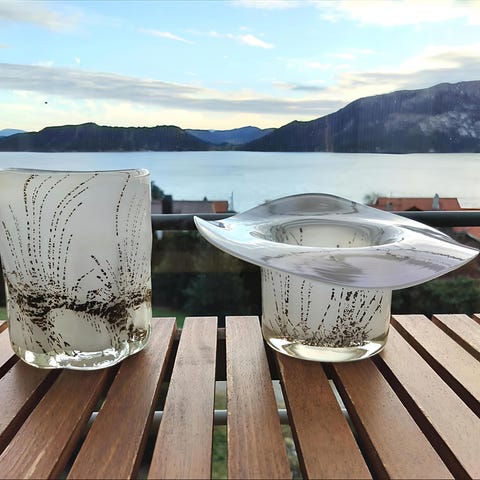 2 stk glasskåler i grå og hvit marmorert design. Skålene har en firkantet fot og en bred, åpen form. Passer til dekorasjon eller servering.