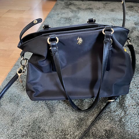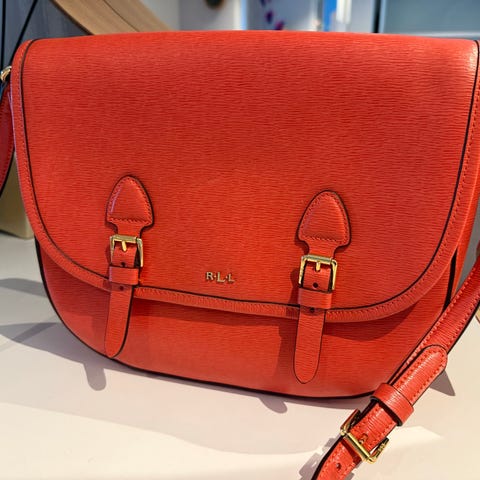 Ralph Lauren skulderveske laget av svart lær. Vesken har justerbar skulderrem med gullfargede metallbeslag. Innvendig fôr med flere lommer for oppbevaring.