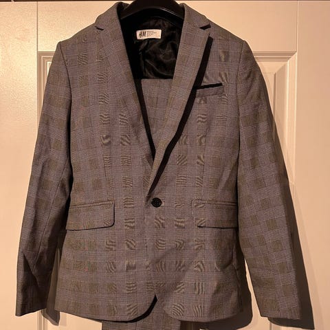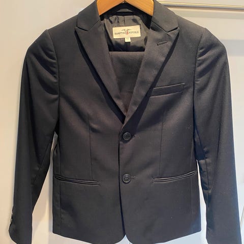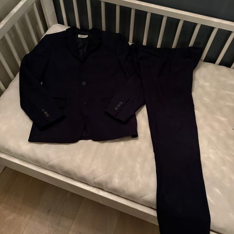 Dressjakke og dressbukse er i størrelse 146, skjorten er i størrelse 140.