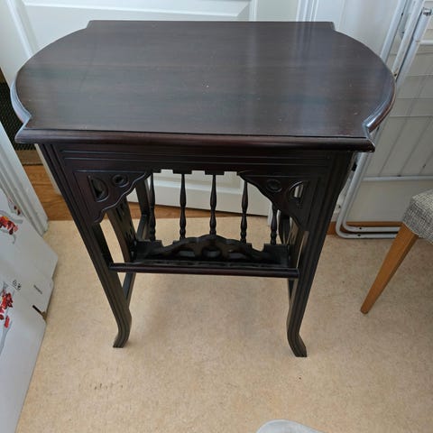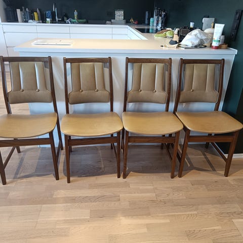 Pent brukt etter nytt trekk på sofa og stoler. Den ene stolen er litt falmet på den ene siden. Sofa: lengde 145cm, 3 lenestoler: bredde 75cm, 2 enkle stoler: bredde 45cm, rygghøyde på alle ca. 90cm og sittehøyde 45cm. Sofabord: lengde 103cm, bredde 58cm, høyde 71cm.