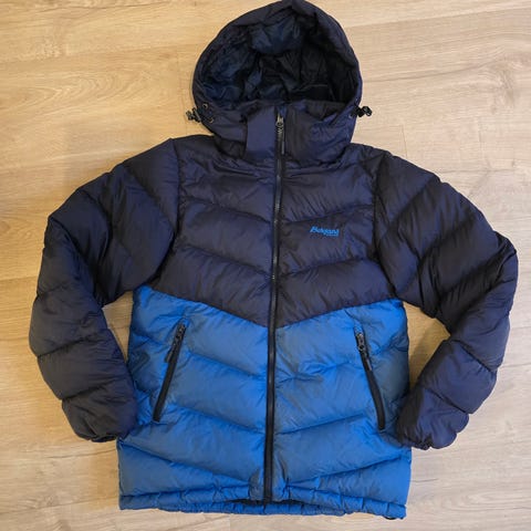 Bergans barn dunjakke i blå farge, størrelse 152, designet for gutt. Jakken har hette og glidelås, egnet for utendørs bruk og varierende værforhold. Grønn bergans tur jakke størrelse 164 , vindtett. Selges 500 kr per jakke