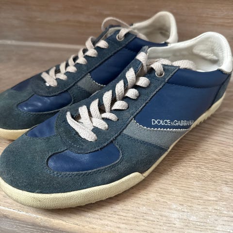 Dolce Gabbana joggesko. Så godt som ubrukt — kun brukt to ganger — og i svært god stand. Disse stilrene blå joggeskoene kombinerer komfort med et tidløst design. Selges kun fordi størrelsen ikke passet helt. Perfekt for deg som ønsker et par sko av høy kvalitet med minimal slitasje.