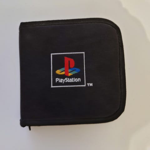 Nesten ubrukt CD-/spill-mappe med glidelås og brodert PlayStation-logo selges. Kjøpt ny sent 1990-tallet / rundt årtusenskiftet.