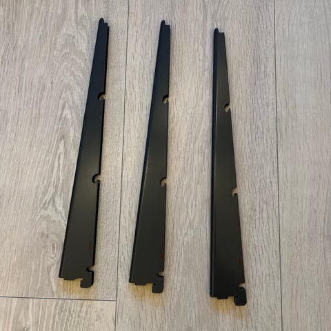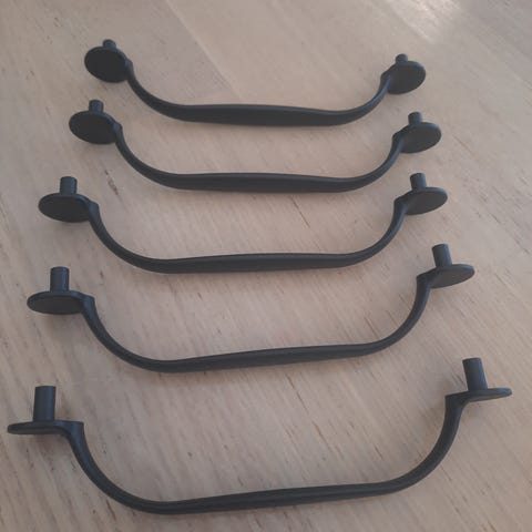 Håndtak fra et Norema kjøkken fra 2016 med 192 mm avstand mellom skruehull. Totalt 18 håndtak. De er tidligere spraylakkert i svart, noen av de som er mest slitt kunne trengt et nytt lag med spraylakk - se bilde.