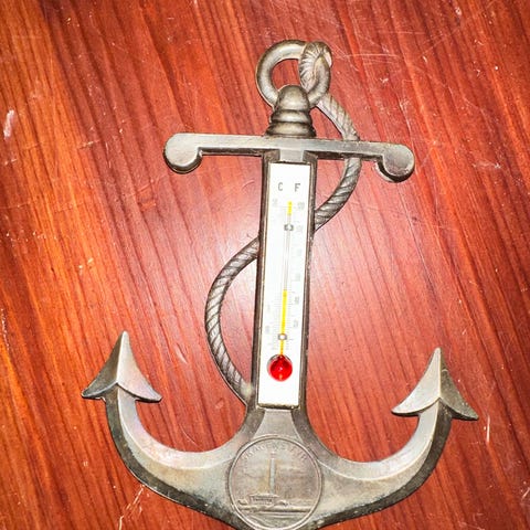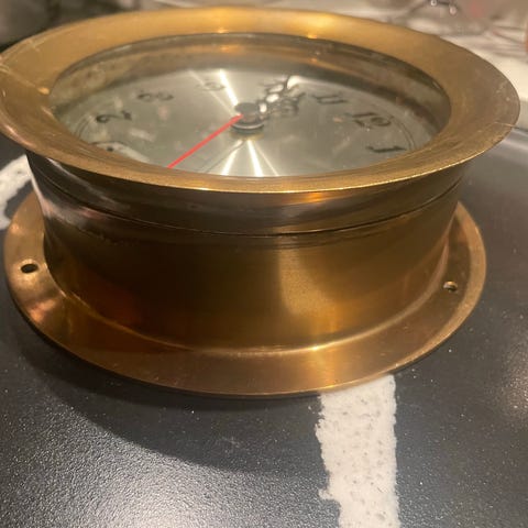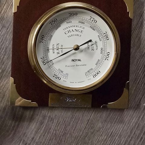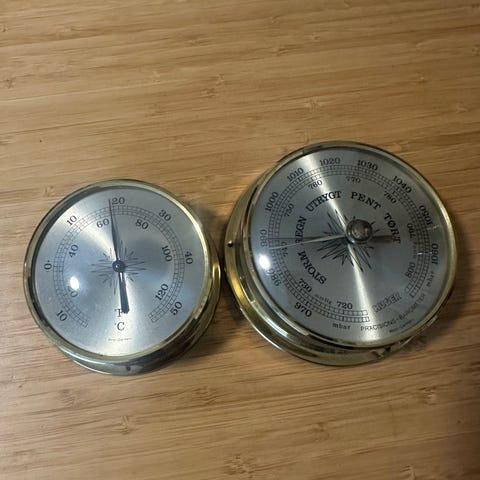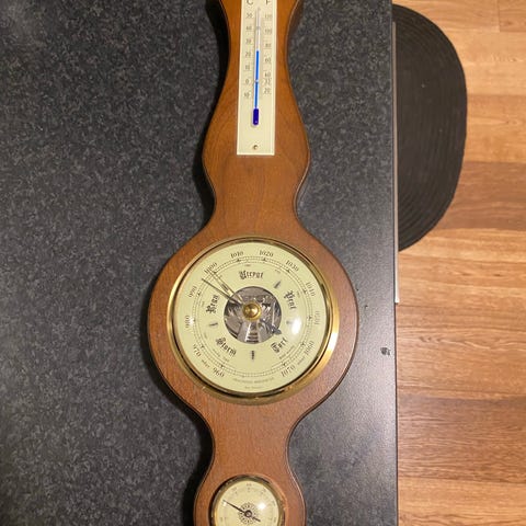 Barometer med rattdesign laget i tre. Instrumentet viser værforhold som regn, normalt og sol, med skala i grader. Barometeret har en dekorativ og nautisk stil, egnet for innendørs bruk som dekorasjon eller værindikator. (AI)