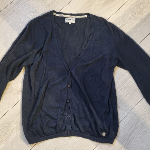 Pent brukt cardigan i mörk grönn farve med kula detaljer med ulike knapper. Klassisk modell i störrelse M, ikke så stor i störrelsen en S-M.
