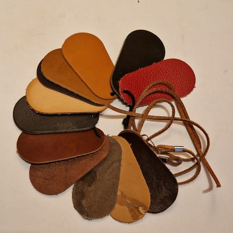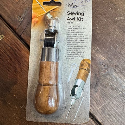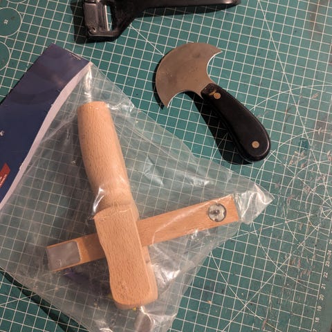 Diverse ub brukt utstyr for skinnsløyd; 2 halvmånekniver, snorkniver, hullpiper for avlange hull, risseverktøy for parallellsøm, alfabet og tall preger verktøy, pregeverktøy med dyrepote etc. Selges samlet
