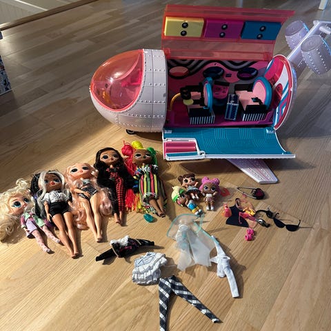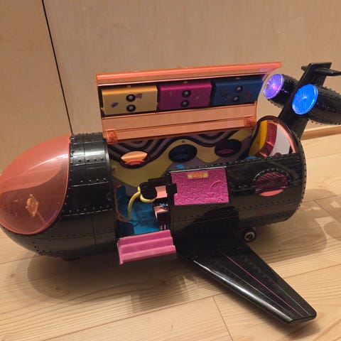 L.O.L. Surprise lekefly i svart og rosa med tilbehør som inkluderer små kofferter og møbler. Flyet har plass til dukker og er designet for lek.