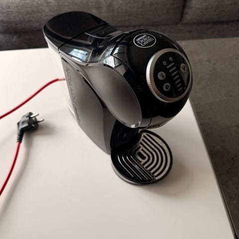 Nescafé Dolce Gusto kaffemaskin i svart farge. Maskinen har en kompakt design med rød kabel og er beregnet for enkel brygging av kaffe. Passer til bruk i hjem eller kontor.