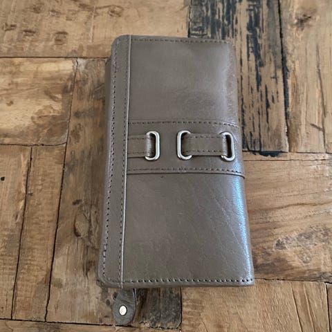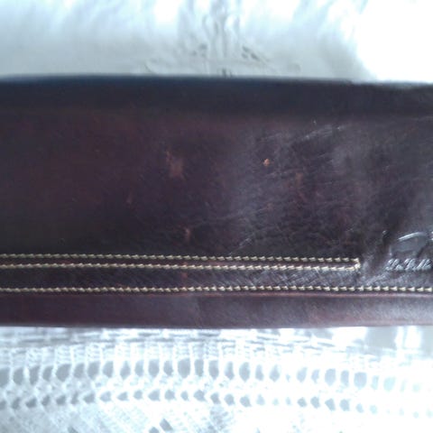 Lommeboken har en knappelukking og inneholder et metallkortetui integrert i lærdekselet.