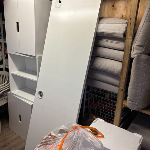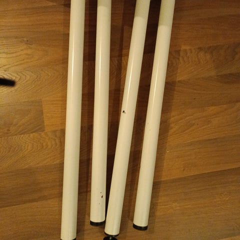 Pent brukt benke-/pult-/bordplate. Følger med to ben. Kan settes opp mot vegg, festes til Kallax el.l., eller hiv på to ben til for selvstående.