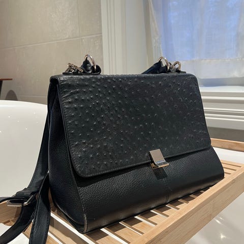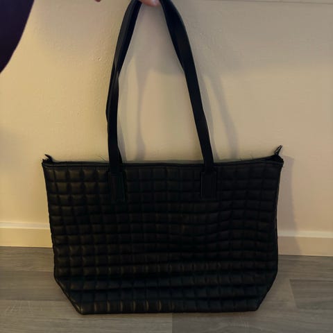 Klassisk Adax-veske i ekte skinn, med to ulike sider slik at du enkelt kan variere uttrykket. Den ene siden har quiltet diamantmønster, den andre er glatt og stilren. Lange håndtak, god plass og et tidløst design som passer både hverdag og jobb. Pent brukt og godt ivaretatt.
