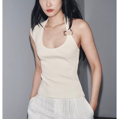 Ny ribbestrikket tanktop fra Lindex i str. XL. Utrolig myk og fin kvalitet. Offwhite med svarte detaljer rund kragen og ermene.