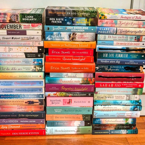 Bokpakke med feelgood romaner. Fire pocket og en innbundet. Innbundet er helt ny men alle pocketene er lest og synlig brukt. Ellers hele og fine.