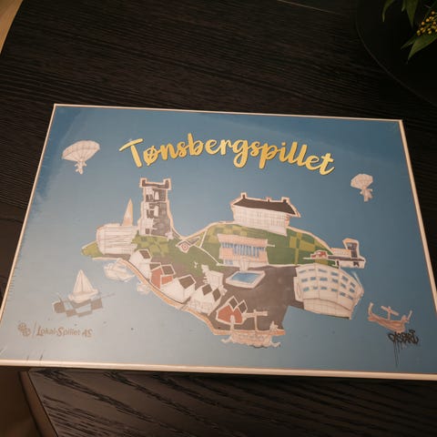 Tønsbergspillet brettspill med illustrert spillebrett og tilhørende kort(monopol. Spillet er basert på Tønsberg kommune og inkluderer lokale elementer. Egnet for flere spillere og familiebruk.