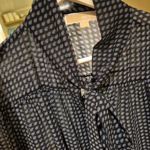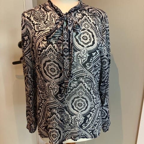 Michael Kors Bluse i størrelse L for dame. Blusen er laget av viskose og har en brun farge med mønster. Materialet og designet gjør den egnet for hverdagsbruk eller mer formelle anledninger.