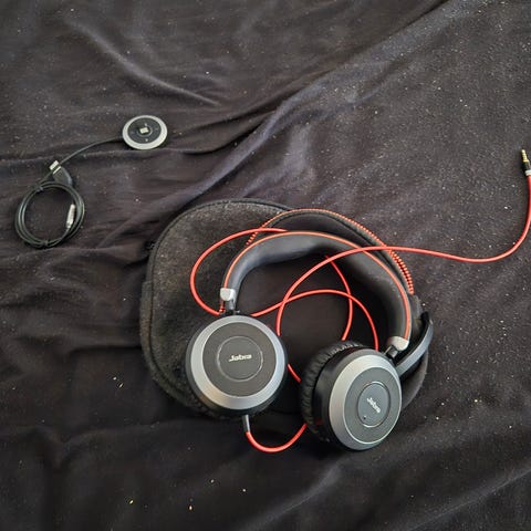 Beats hodetelefoner med tilhørende bæreveske. Hodetelefonene har en svart farge med røde detaljer. Leveres med flere kabler for tilkobling. Bærevesken er hard og har Beats-logo på toppen.