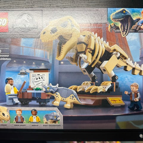 LEGO Jurassic World lekesett med flere dinosaurfigurer og et kjøretøy. Inkluderer detaljerte minifigurer og tilbehør.