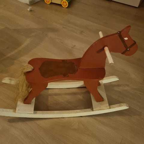 IKEA Rir barn gyngedyret i rødt og naturfarget tre. Egnet for barn til lek og utvikling av balanse og motoriske ferdigheter.