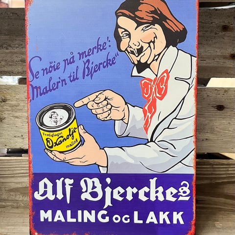 Alf Bjercke Maling Og Lakk. Skilt I Tynnmetall 20X30 Cm. Dekor, Historie