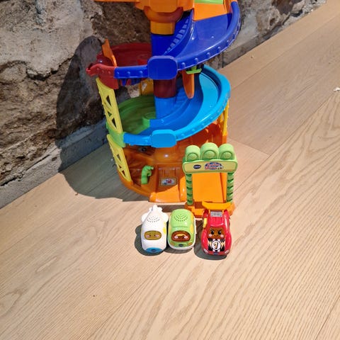 Selger en VTech Toot-Toot Drivers Garage/Service Centre (bilgarage/verksted) med flere funksjoner: heis (lift), rampe, “repair”-stasjon og “helipad”-del. Mange knapper/elementer å trykke og leke med – veldig populær hos små barn.