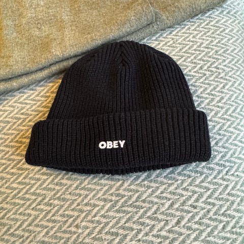 Pent brukt grønn Obey-lue/caps selges. Ingen skader eller flekker, og sitter veldig bra på hodet. Passer til både hverdags og streetwear. Klar til bruk.