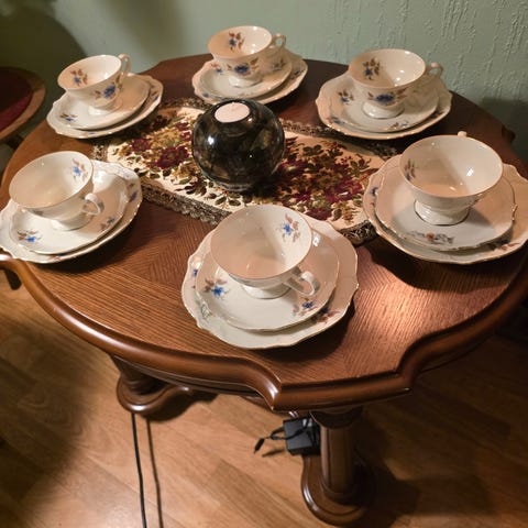 Servise til 12 personer selges inkludert, tekanne, sukkerskål og fløtemugge. Pent og så og si ikke brukt.