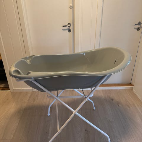 Pent brukt badekar/balje med babyinnsats, på stativ. En del rust på stativ, se bilde selges for 50 kr