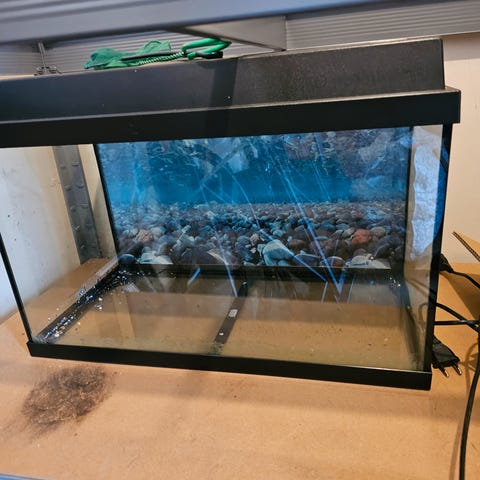 Akvarium 105 liter m/bord, ledlys, varme, pumpe, sand og div utstyr.