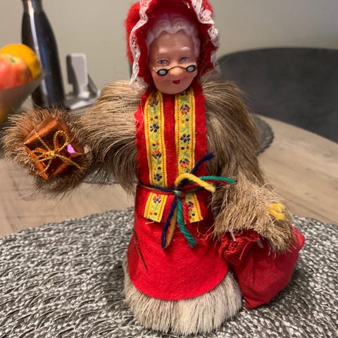 Nydelig nissekone i reinsdyrskinn. Hun holder norsk flagg og en kurv med epler. Vintage, gammel julepynt.