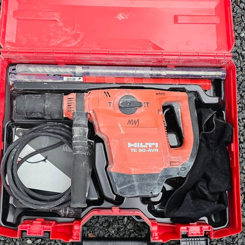 Hilti TE 72 borhammer med tilbehør inkludert bor og meisel. Verktøyet er rødt og designet for tungt arbeid med slagboring i betong og murverk. Leveres i oppbevaringskoffert.