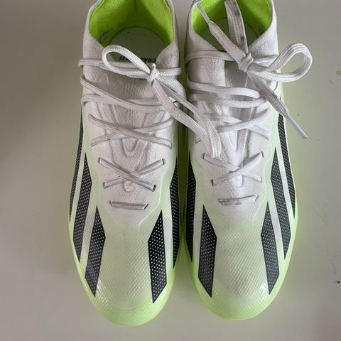 Adidas fotballsko i svart med hvite striper. Skoene har knotter under for bruk på gressbaner. Materialet er syntetisk, og skoene er designet for fotballspill.