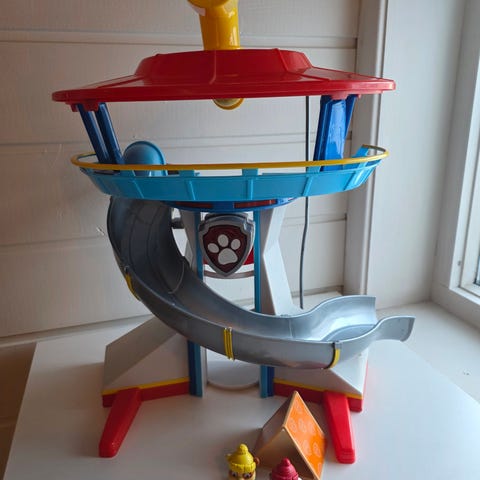 Jeg har vokst i fra mitt valpetårn og vil selge det til andre som liker Paw Patrol. Du får med et fullt sett med biler og figurer. Noen av figurene er slitte og skranglete (Rocky har mistet en fot), men går veldig fint å leke med ennå! Tårnet virker som det skal, inkl. lydeffekter.