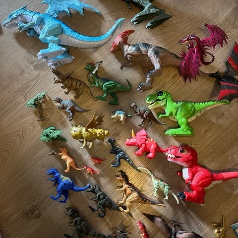 Fem dinosaurer og et dinosaur skjelett selges samlet. Pent brukt. To dinosaurer med lyd.