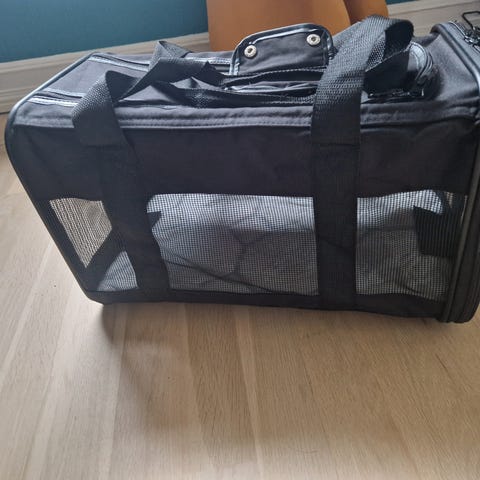 Reisebag til lite dyr. Lengde 36 cm, høyde 21,5 cm, bredde 26,5 cm. Brukt én gang ved import av kattunge. Hadde den under sete i flykabin på et KLM-fly. Vaskbart underlag som festes med borrelås i bag'en. Nypris: 1200 kr. Kan leies ut for 100 kr pr døgn/300 kr for én uke/400 kr for to uker. Depositum på 600 kr ved utleie