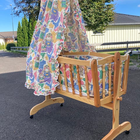 Flott Vugge barnemøbel med trestruktur og fargerikt tekstiltrekk. Egnet for barn, designet for trygg og komfortabel bruk.