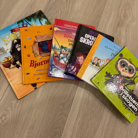 Pakke med fire barnebøker med illustrasjoner. Inneholder bøkene: "Den lille kaninen som så gjerne ville sove nå", "En gave til Nasse", og "Politihunden Peter", Kaptein Sabeltann og blindpassasjeren, Bjørnis - Besøk på brannstasjonen. Passer for barn og inneholder fargerike illustrasjoner.