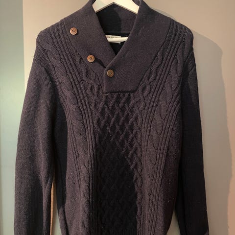 Lys blå lett melert middels tykk 100% Shetlandsull jakke. Ikke brukt, kjøpt i Edinburgh, Skottland i ullbutikk. Måler armhule til armhule 52 cm, hel lengde 63 cm. Sølv knapper med logo på. Vakkert skulderparti mtp felling. Pene vrangborder. Vasket forsiktig 30 grader håndvask ull vaskemiddel. Nypris 1200,- Kan sende.