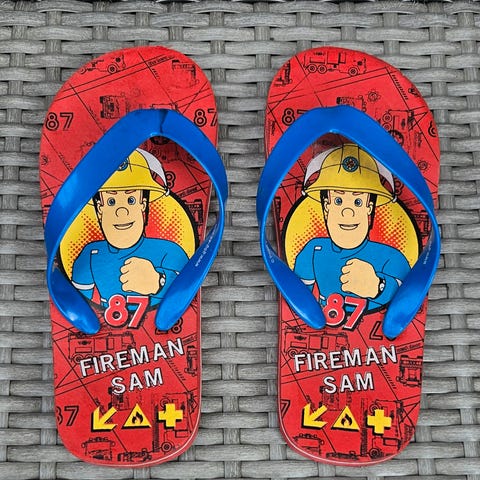Brannmann Sam tøfler for barn i rød og blå farge. Tøflene har brannmannmotiv og er designet for innendørs bruk.