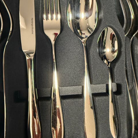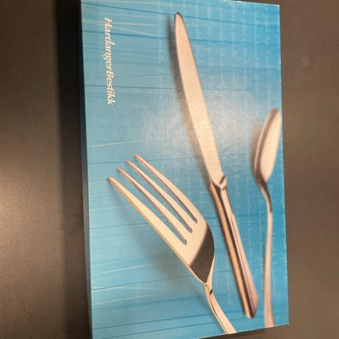 Inkluderer gafler, kniver, spiseskjeer og teskjeer, 8 stk av hver.