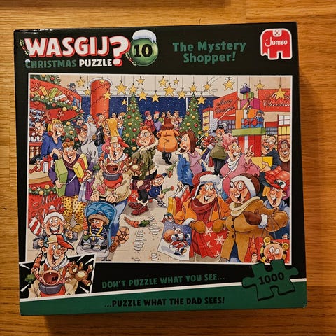 Wasgij Mystery Puzzle 17 Catching a Break puslespill med dimensjoner 68 x 49 cm. Illustrert av Paul Gibbs og produsert av Jumbo. Inneholder 1000 brikker.