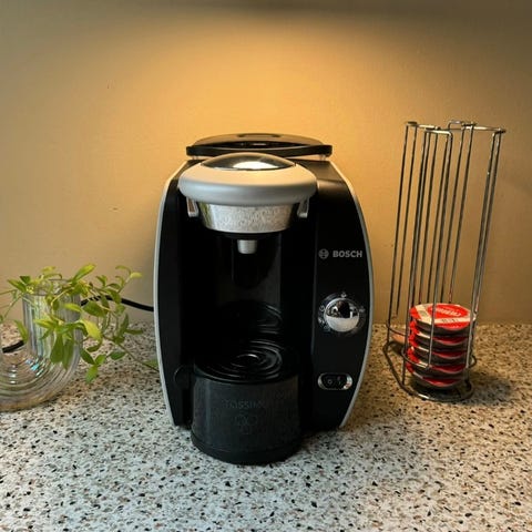 Bosch Tassimo kaffemaskin i svart farge. Maskinen er designet for bruk med Tassimo kapsler og har en vannbeholder på baksiden. Maskinen er pent brukt og i god tilstand, alt fungerer som den skal.