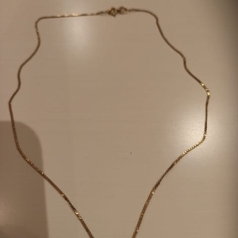 Fantastisk fint halskjede i 585 gull. Kjedet fremstår svært lite brukt. Lengde 46 cm. Vekt 2,47 g. Sendes mot forskuddsbetaling. Ønsker ikke å benytte fiks ferdig.